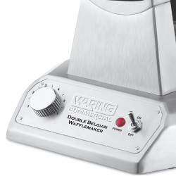 Gaufrier professionnel à gaufre classique en modèle double de 1400W permettant de préparer jusqu’à 40 gaufres de 2,5cm d’épaisseur par heure, système tournant pour une cuisson uniforme, bip sonore de fin de cuisson, voyants de mise sous tension et de préchauffage et plaque à triple revêtement antiadhésif pour faciliter l’entretien