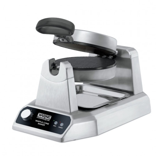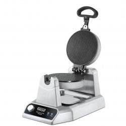 Gaufrier professionnel à cornet de glace en modèle simple de 1200W permettant de préparer jusqu’à 60 cornets par heure, système tournant pour une cuisson uniforme, bip sonore de fin de cuisson, voyants de mise sous tension et de préchauffage et plaque remplaçable à triple revêtement antiadhésif pour faciliter l’entretien - Cône pour former un cornet de glace inclus