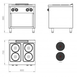 Fourneaux électrique sur placard – 4 plaques – Puissance : 10,4 kW – Plaques : 2,6 kW (x4) - Plaques électriques de haute efficacité thermique – Acier inoxydable AISI 316