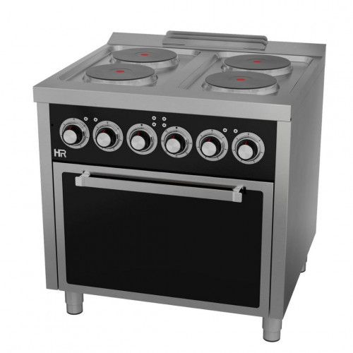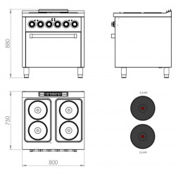 Fourneaux électrique avec fours – 4 plaques – Puissance : 15,4 kW – Plaques : 2,6 kW (x4) // Fours : 5 kW- Plaques électriques de haute efficacité thermique – Acier inoxydable AISI 316 - Fours Gastronorme 2/1 - Grill inclus - Grille de four amovible avec système anti-capotage – Vanne thermostatique dans le four - Four avec allumage automatique – Thermocouple de sécurité – Grilles de four facilement amovibles, pour nettoyage facile – Bourrelet de fibre en verre, haute résistance et haute efficacité énergétique – Pieds réglables - Thermostat de régulation de 50°C à 300°C