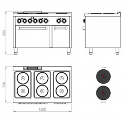 Fourneaux électrique avec fours – 6 plaques – Puissance : 20,6 kW – Plaques : 2,6 kW (x6) // Fours : 5 kW- Plaques électriques de haute efficacité thermique – Acier inoxydable AISI 316 - Fours Gastronorme 2/1 - Grill inclus - Grille de four amovible avec système anti-capotage – Vanne thermostatique dans le four - Four avec allumage automatique – Thermocouple de sécurité – Grilles de four facilement amovibles, pour nettoyage facile – Bourrelet de fibre en verre, haute résistance et haute efficacité énergétique – Pieds réglables - Thermostat de régulation de 50°C à 300°C