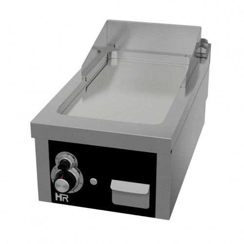 Fry-Top à gaz à poser - Puissance : 8 kW – Plancha en acier métallique d’épaisseur 15 mm - Boitier en acier inoxydable avec tiroir collecteur de graisse situé à l’avant – Thermocouple de sécurité - Pieds réglables – Plaque de cuisson soudée au sommet – Chaque bruleur à un allumage automatique – Vanne thermostatique