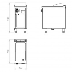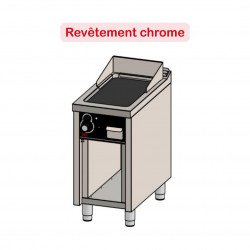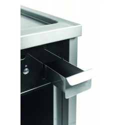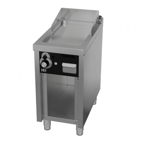 Fry-Top sur meuble à gaz - Puissance : 8 kW – Plancha en acier métallique d’épaisseur 15 mm - Boitier en acier inoxydable avec tiroir collecteur de graisse situé à l’avant – Thermocouple de sécurité - Pieds réglables – Plaque de cuisson soudée au sommet – Chaque bruleur à un allumage automatique – Vanne thermostatique