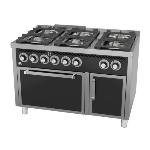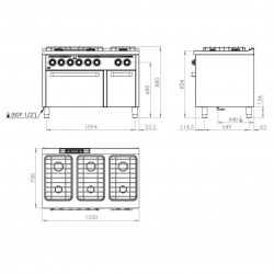 Fourneaux à gaz avec four électrique– 6 brûleurs - Puissance: 45,9 kW - Brûleurs supérieurs nickelés de haute efficacité thermique – Acier inoxydable – Grilles supérieures en acier chromé – Grille de four amovible avec système anti-capotage – Vanne thermostatique dans le four - Four avec allumage automatique – Thermocouple de sécurité – Grilles de four facilement amovibles, pour nettoyage facile – Cheminée de hauteur minimal, pour utilisation de casseroles de grand diamètre – Bourrelet de fibre en verre, haute résistance et haute efficacité énergétique – Pieds réglables