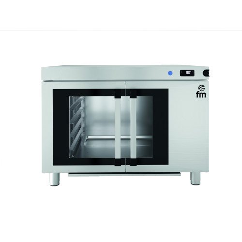 Etuve - Capacité : 10 x (600x400) / 5 x (600x800) - Extérieur et intérieur inox - Température maximum 85°C - Porte en verre trempé - Supports pour plateaux amovibles pour faciliter le nettoyage - Possibilité de choisir chaleur sèche ou humide - Distance entre les niveaux : 80mm - Plaques non fournie - Puissance : 1400 w