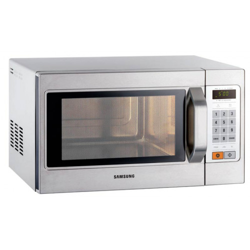 Four à micro-ondes série Samsung - Extérieur et intérieur en inox - Capacité : 26l - Sole fixe en céramique - Dimensions intérieures : 336x349x190 - Grande cavité : capacité GN2/3 - Commandes programmables - 4 niveaux de puissance - Temps réglable de 1 seconde à 30min - 20 programmes + bouton 30 secondes + bouton double quantité - Fonction décongélation - Eclairage intérieur - Doublure monobloc lavable au lave-vaisselle - Système à double magnétron - Poignée d'ouverture avec grande fenêtre d'affichage - Puissance : 1055 w