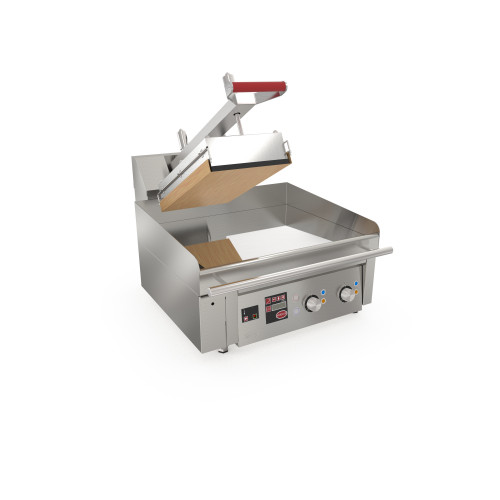 Plaque au chrome électrique avec presse - Surface utile de la plaque : 600x500 + 1 presse 250x450 - Puissance : 12 kW - Carrosserie inox AISI-304 - Plaque avec bain de chrome dur de 50 microns et épaisseur 18 mm - 2 programmes pour la presse - Commandes mécaniques pour la plaque - Commandes électroniques pour la/les presse(s) - Relevage automatique selon le programme - Réduction du temps de cuisson de 50% - Surface anti-adhérentes - Facile à utiliser et à nettoyer - 1 tiroir à graisse avec une capacité de 4 litres - LIVRÉ AVEC TISSUS ANTI-ADHERENT TEFLON, PRODUIT DE NETTOYAGE POUR TEFLON, RACLETTE, BROSSE METALLIQUE ET SPATULE