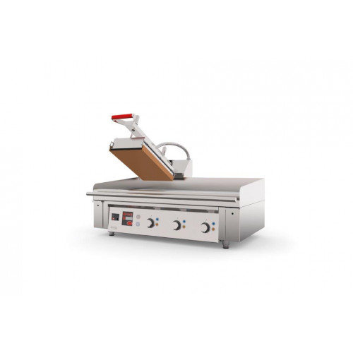 Plaque au chrome électrique avec presse - Surface utile de la plaque : 900x500 + 1 presse 250x450 - Puissance : 16 kW - Carrosserie inox AISI-304 - Plaque avec bain de chrome dur de 50 microns et épaisseur 18 mm - 2 programmes pour la presse - Commandes mécaniques pour la plaque - Commandes électroniques pour la/les presse(s) - Relevage automatique selon le programme - Réduction du temps de cuisson de 50% - Surface anti-adhérentes - Facile à utiliser et à nettoyer - 2 tiroirs à graisse avec une capacité de 4 litres chacun - LIVRÉ AVEC TISSUS ANTI-ADHERENT TEFLON, PRODUIT DE NETTOYAGE POUR TEFLON, RACLETTE, BROSSE METALLIQUE ET SPATULE