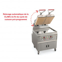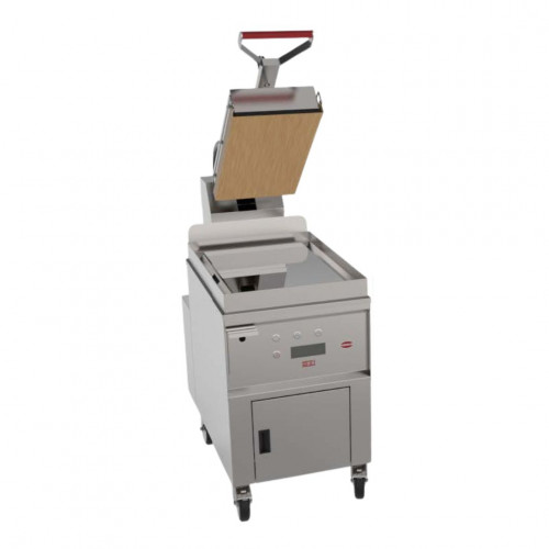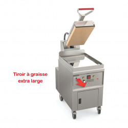 Plaque au chrome électrique - Zone de chauffe : 400x600 + 1 presse 285x565 - Puissance : 10 kW - Carrosserie entièrement inox AISI-304 - 9 programmes de cuisson automatiques - Cuisson ultra-rapide : réduction du temps de cuisson de près de 50% - T° d'utilisation : min. 150° / max. 232°C - Plaque inférieure recouvert de chrome dur de 50 microns - Contrôleur électronique qui pilote la température et le temps de la plaque inférieure et supérieure - Relevage automatique en fin de cuisson avec signal sonore - Livré sur socle avec 4 roulettes dont 2 avec freins - 1 tiroir à graisse avec une capacité de 5,3 litres - LIVRÉ AVEC TAPIS EN TEFLON, PRODUIT DE NETTOYAGE, RACLETTE, BROSSE METALLIQUE ET SPATULE