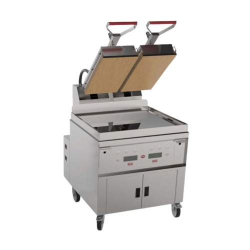 Plaque au chrome électrique - Zone de chauffe : 700x600 + 2 presses 285x565 - Puissance : 20 kW - Carrosserie entièrement inox AISI-304 - 2 x 9 programmes de cuisson automatiques - Cuisson ultra-rapide : réduction du temps de cuisson de près de 50% - T° d'utilisation : min. 150° / max. 232°C - Plaque inférieure recouvert de chrome dur de 50 microns - Contrôleur électronique qui pilote la température et le temps de la plaque inférieure et supérieure - Relevage automatique en fin de cuisson avec signal sonore - Livré sur socle avec 4 roulettes dont 2 avec freins - 2 tiroirs à graisse avec une capacité de 5,3 litres - LIVRÉ AVEC TAPIS EN TEFLON, PRODUIT DE NETTOYAGE, RACLETTE, BROSSE METALLIQUE ET SPATULE