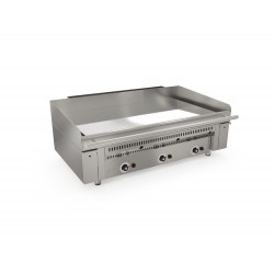 Plaque au chrome gaz haut rendement - Zone de chauffe : 900x500 - 3 zones de cuisson - Puissance : 33 kW - Carrosserie entièrement inox 18/10 - Plancha lisse ou rainurée (option, en standard à droite) - Partie supérieure en alliage d'acier en finition acier rectifié miroir de 18mm d'épaisseur recouvert d'une couche de chrome dur 50 microns - Vanne thermostatique indépendante par zone capables d'atteindre 290°C - Régulation par valve thermostatique avec contrôle de flamme par thermo-couple et allumage par piezzo électrique - Brûleurs en fonte - 1 tiroir à graisse en façade avec une capacité de 5 litres