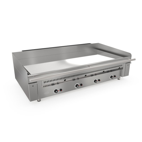 Plaque au chrome gaz haut rendement - Zone de chauffe : 1200x600 - 4 zones de cuisson - Puissance : 44 kW - Carrosserie entièrement inox 18/10 - Plancha lisse ou rainurée (option, en standard à droite) - Partie supérieure en alliage d'acier en finition acier rectifié miroir de 18mm d'épaisseur recouvert d'une couche de chrome dur 50 microns - Vanne thermostatique indépendante par zone capables d'atteindre 290°C - Régulation par valve thermostatique avec contrôle de flamme par thermo-couple et allumage par piezzo électrique - Brûleurs en fonte - 1 tiroir à graisse en façade avec une capacité de 5 litres