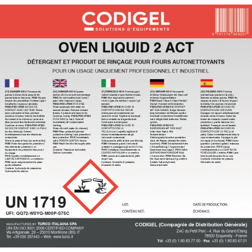 Détergent alcalin, conçu pour les fours autonettoyants et à convections. Élimine la saleté la plus tenace, y compris les graisses brûlées, en un seul cycle de lavage. Son action éclaircissante laisse la chambre du four brillante et sans traces. Éviter le contact avec l'aluminium - Conditionnement bidon de 10KG