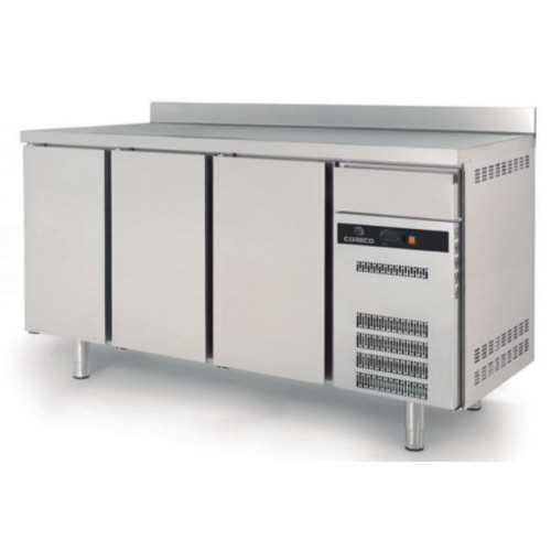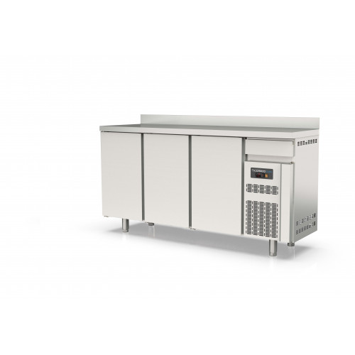 ARRIÈRE BAR S-Line - Température -2°/+8°C - 3 portes pleines - Tiroir neutre sur groupe - Capacité 540L - Extérieur et intérieur en inox AISI-304 18/10 (sauf partie arrière en galva) - Dosseret de 100mm - Porte emboutie réversible - Charnières inox - Joint de porte démontable - Pieds inox réglables de 125 à 200mm - Livré avec 2 clayettes rilsan par porte réglable en hauteur sur supports plastique -Thermostat électronique avec afficheur digital, spécial économie d'énergie - Evaporation automatique des eaux de dégivrage - Evaporateur ventilé traité anti-corrosion et condenseur ventilé et extractible - Ambiance 40°C - Alarme haute et basse température sur contrôleur digital