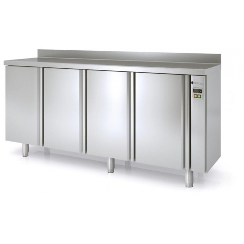 ARRIÈRE BAR groupe à distance - Température -2°/+8°C - 4 portes pleines - Capacité 740L - Extérieur et intérieur en inox AISI-304 18/10 (sauf partie arrière en galva) - Dosseret de 100mm (sans dosseret sur demande) - Livré sans groupe, sans capillaire ni détendeur - Bandeaux de commande démontables - Thermostat électronique avec afficheur digital, spécial économie d'énergie - Pas d'évaporation des eaux de condensat - Porte emboutie et réversible - Charnières inox - Joint de porte déclipsable - Pieds inox réglables (hauteur meuble possible 900) - Livré 2 clayettes rilsan par porte réglable en hauteur sur support inox - Ambiance 43°C - Alarme haute et basse température sur contrôleur digital