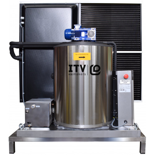 Machine à écailles - Gamme SCALA - Production (24H): +/- 1500kg - Refroidissement AIR - Glace à écailles (1,5 - 2,2mm) - Ensemble monobloc avec générateur de glace + groupe frigorifique complet monté sur châssis + équipement électrique - Sans carrosserie - Compresseur : 3+3 cv - Vidange : 25 mm - A adapter sur bac de stockage ou directement sur chambre froide