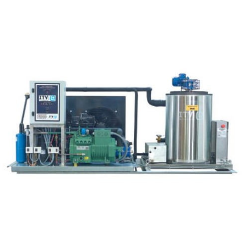 Machine à écailles - Gamme SCALA - Production (24H): +/- 3000kg - Refroidissement AIR - Glace à écailles (1,5 - 2,2mm) - Ensemble monobloc avec générateur de glace + groupe frigorifique complet monté sur châssis + équipement électrique - Sans carrosserie - Compresseur : 15 cv - Vidange : 21 mm - A adapter sur bac de stockage ou directement sur chambre froide