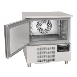 Cellule de refroidissement et congélation - Dimensions : 800X800X900mm - Capacité 5 niveaux GN1/1-40 - Capacité 4 niveaux 60x40 - Capacité en L: 85 - Cycle avec sonde: oui - Cycle par temps: oui - Extérieur en acier inoxydable AISI-304, à l’exception de l’arrière et du fond. - Intérieur en acier inoxydable AISI-304 - 230/1/50 - Portes avec système de fermeture automatique et joint magnétique (reste ouvert au-delà de 90° d’ouverture). - Plan de travail en acier inoxydable AISI-304 - Groupe de condensation ventilé - Froid ventilé, avec revêtement époxy anticorrosion - Détendeur thermostatique - Isolation en polyuréthane injecté, densité 40 Kg/m³