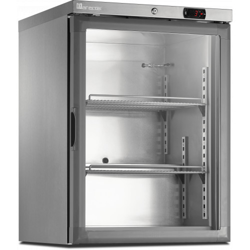 Mini armoire porte vitrée - température négative (-22/-18°C) - Volume : 115L, - Intérieur aluminium, extérieur inox AISI 441 - Porte réversible - Thermostat Digital - Porte à fermeture automatique - Isolation en polyuréthane à base d’eau 60mm - Froid statique - Dégivrage manuel - Serrure incluse - 4 pieds réglables - 230 V – 50 Hz - Eclairage LED
