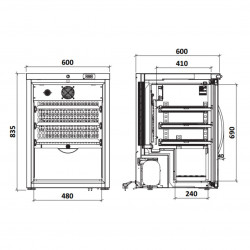 Armoire à vin mono-température - Gamme Service - Tôle plastifiée extérieure (skinplate noir) - Froid ventilé avec dégivrage automatique - Porte en verre réversible - Éclairage LED - Serrure standard - Température définie par l’utilisateur Isolation 50 mm de polyuréthane à base d’eau - Étagères amovibles en bois 1 x (480x375mm) + 1 x (480x255mm) - 4 Pieds de nivellement