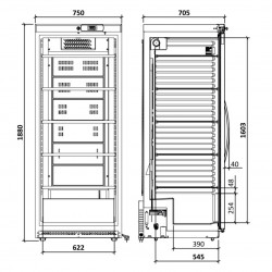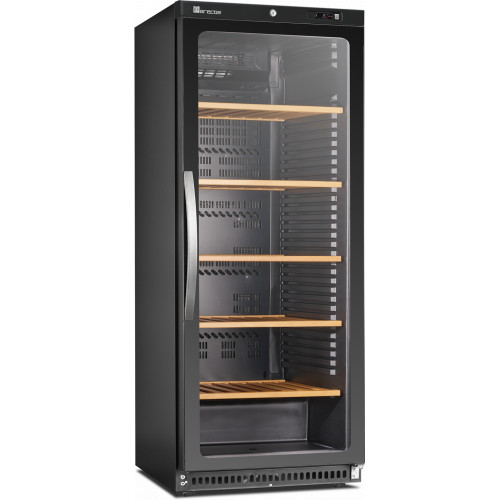 Armoire à vin mono-température - Gamme Service - Tôle plastifiée extérieure (skinplate noir) - Froid ventilé avec dégivrage automatique - Porte en verre réversible - Éclairage LED - Serrure standard - Température définie par l’utilisateur Isolation 60 mm de polyuréthane à base d’eau - Étagères en bois 5 x (494x430mm) - 4 curseurs + 2 pieds de nivellement