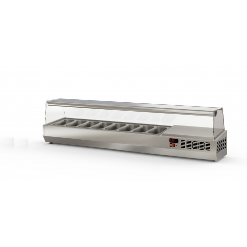 Présentoir à ingrédients 1/4 - Gamme pare-haleine - Tout inox 18/10 pour recevoir 8 bacs GN 1/4 profondeur 150 mm (bacs non fournis) - thermostat électronique avec afficheur digital, spécial économie d'énergie - Alarme haute et basse température - Evaporateur par plaque froide - Eclairage intérieur - Température de travail +2°/+8°C - Livrée sur tampons réglables (pieds 140 mm en option) - Ambiance 43°C