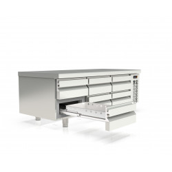 Meuble - Série soubassement GN1/1 Hauteur 600 - Température -2°/+8°C - 3x2 tiroirs GN1/1 prof. 100 + évaporateur entre les portes - Capacité 6 bacs GN1/1 - Extérieur et intérieur en inox AISI-304 18/10 (sauf partie arrière en galva) - Pieds inox réglables (90 à 125mm) - Tiroirs réfrigérés démontables en inox sur glissières télescopiques avec système d'auto-fermeture - Idéal pour poser de petits éléments de cuisson longueur 400mm, sous vide, trancheur... - Thermostat électronique avec afficheur digital, spécial économie d'énergie - Compresseur hermétique ventilé sur glissières - Evaporateur ventilé traité anti-corrosion - Evaporation automatique des eaux de dégivrage - Ambiance 32°C - Alarme haute et basse température sur contrôleur digital