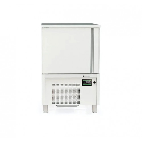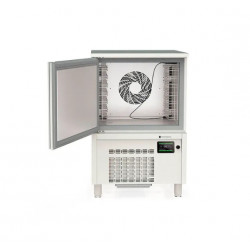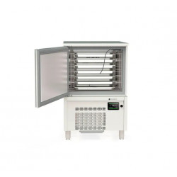 Cellule de refroidissement et congélation - Dimensions : 800X800X1240mm - Capacité 7 niveaux GN1/1-40 - Capacité 7 niveaux 60x40 - Capacité en L: 118 - Cycle avec sonde: oui - Cycle par temps: oui - Extérieur en acier inoxydable AISI-304, à l’exception du dossier. - Intérieur en acier inoxydable AISI-304 - 230/1/50 - Portes avec système de fermeture automatique et joint magnétique (reste ouvert au-delà de 90° d’ouverture). - Micro-interrupteur inductif d’ouverture de porte - Plan de travail en acier inoxydable AISI-304 -Groupe de condensation ventilé - Froid ventilé, avec revêtement époxy anticorrosion - Détendeur thermostatique - Isolation en polyuréthane injecté, densité 40 Kg/m³ - Panneau de contrôle graphique avec écran tactile TFT de 5”, IP 65 - Gestion avancée des fonctions des cellules de refroidissement rapide dernière génération - Connectivité RS-485 et USB - Sonde de température détachable et chauffée, incluse. - Gestion des cycles par temps ou par température - Test d’insertion de la sonde (gestion de la température) - Enregistrement des données HACCP, visualisables à l’écran ou téléchargeables via le port USB au format CSV - Cycles de réfrigération et de congélation “hard/soft”. - 4 combinaisons de cycles standard - Programmation des cycles continues par température ou par temps - Multiples programmes personnalisables - Dégivrage par résistance en début de cycle, optimisé par la température - Gestion efficace de la consommation d’énergie