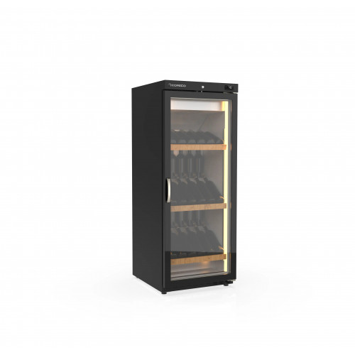 Armoire à vin - Température positive (+2°/+18°C) - Capacité 240L - 1 porte vitrée - Extérieur en acier plastifié noir et intérieur en acier inoxydable - Dégivrage et évaporation par résistance - Eclairage intérieur LEDs - Alarme haute et basse température sur contrôleur digital - Dotation : 4 niveaux d'étagères avec façade en bois (inclinaison possible 20°)