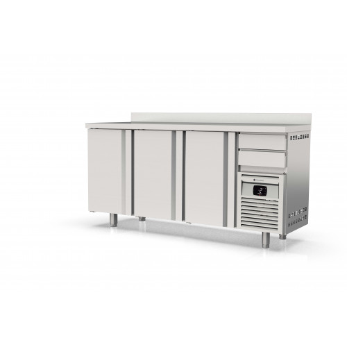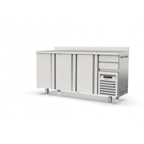 ARRIÈRE BAR - Température -2°/+8°C - 3 portes pleines + 2 tiroirs neutres sur groupe - Capacité 540L - Extérieur et intérieur en inox AISI-304 18/10 (sauf partie arrière en galva) - Dosseret de 100mm (sans dosseret sur demande) - Thermostat électronique avec afficheur digital, spécial économie d'énergie - Evaporation automatique des eaux de dégivrage - Porte emboutie et réversible - Charnières inox - Joint de porte déclipsable - Evaporateur ventilé traité anti-corrosion et condenseur ventilé et extractible - Pieds inox réglables (hauteur meuble possible 900) - Livré avec 2 clayettes rilsan par porte réglable en hauteur sur support inox - Ambiance 40°C - Alarme haute et basse température sur contrôleur digital