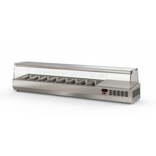 Présentoir à ingrédients 1/3 - Gamme pare-haleine - Tout inox 18/10 pour recevoir 8 bacs GN 1/3 profondeur 150 mm (bacs non fournis) - thermostat électronique avec afficheur digital, spécial économie d'énergie - Alarme haute et basse température - Evaporateur par plaque froide - Eclairage intérieur - Température de travail +2°/+8°C - Livrée sur tampons réglables (pieds 140 mm en option) - Ambiance 43°C