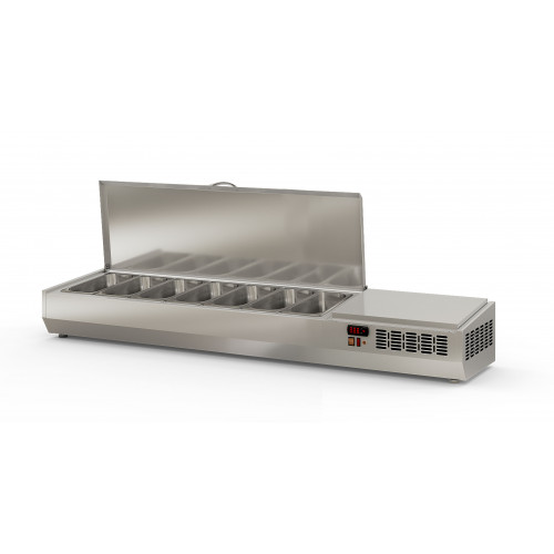 Présentoir à ingrédients 1/3 - Gamme couvercle inox - Tout inox 18/10 pour recevoir 7 bacs GN 1/3 profondeur 150 mm (bacs non fournis) - Thermostat électronique avec afficheur digital, spécial économie d'énergie - Alarme haute et basse température - Evaporateur par plaque froide - Température de travail +2°/+8°C - Livrée sur tampons réglables (pieds 140 mm en option) - Ambiance 43°C