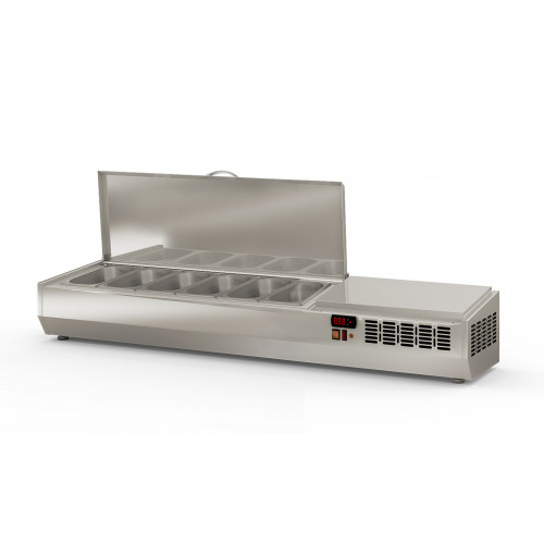Présentoir à ingrédients 1/4 - Gamme couvercle inox - Tout inox 18/10 pour recevoir 6 bacs GN 1/4 profondeur 150 mm (bacs non fournis) - Thermostat électronique avec afficheur digital, spécial économie d'énergie - Alarme haute et basse température - Evaporateur par plaque froide - Température de travail +2°/+8°C - Livrée sur tampons réglables (pieds 140 mm en option) - Ambiance 43°C