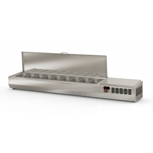Présentoir à ingrédients 1/4 - Gamme couvercle inox - Tout inox 18/10 pour recevoir 9 bacs GN 1/4 profondeur 150 mm (bacs non fournis) - Thermostat électronique avec afficheur digital, spécial économie d'énergie - Alarme haute et basse température - Evaporateur par plaque froide - Température de travail +2°/+8°C - Livrée sur tampons réglables (pieds 140 mm en option) - Ambiance 43°C