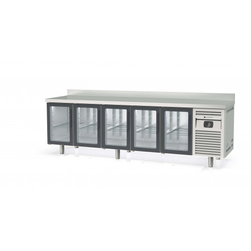 Meuble 700 négatif - Série GASTRO - Température -2°/+8°C - 5 portes vitrées (double vitrage + éclairage LED)- Capacité 820L - Extérieur et intérieur en inox AISI-304 18/10 (sauf partie arrière en galva) - Dosseret de 100mm (sans dosseret sur demande) - Thermostat électronique avec afficheur digital, spécial économie d'énergie - Evaporateur ventilé traité anti-corrosion - Groupe extractible sur glissière - Alarme haute et basse température - Evaporation automatique des eaux de dégivrage - Porte emboutie et réversible - Charnières inox - Joint déclipsable - Pieds inox réglables (hauteur meuble possible 900) - Livré avec 1 clayette inox GN1/1 par porte + 1 jeu de glissières par porte - Ambiance 32°C