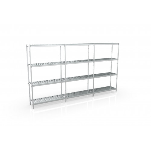 Rayonnage linéaire 4160x1670x400 4 niv - Spécialement conçu pour usage alimentaire - Structure aluminium anodisée - Clayettes en polyéthylène qualité alimentaire - Vis en acier inoxydable - Compatible à une utilisation en chambres froides, à la fois pour des températures positives comme négatives - Assemblage facile et sans outil