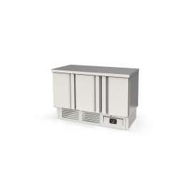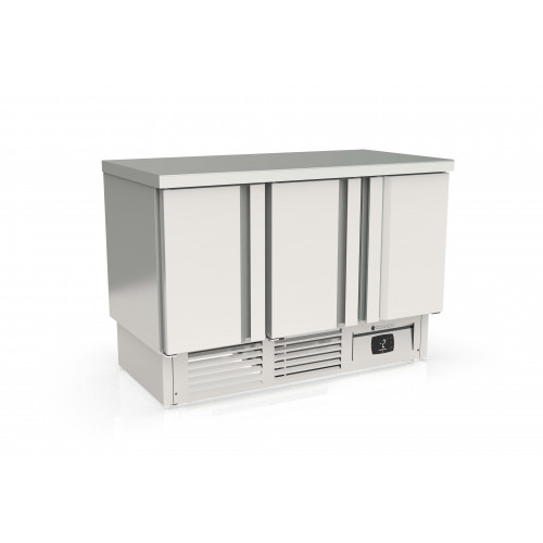 Meuble 700 positif - Série GASTRO compact - Température -2°/+8°C - 3 portes pleines - Capacité 450L - Extérieur et intérieur en inox AISI-304 18/10 (sauf partie arrière en galva) - Sans dosseret (dosseret sur demande) - Thermostat électronique avec afficheur digital, spécial économie d'énergie - Compresseur hermétique ventilé sur glissières - Evaporateur ventilé traité anti-corrosion - Evaporation automatique des eaux de dégivrage - Porte emboutie et réversible - Charnières inox - Tampons - Livré avec 1 clayette inox GN1/1 par porte + 1 jeu de glissières par porte - Ambiance 40°C - Alarme haute et basse température sur contrôleur digital