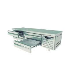 Meuble - Série soubassement GN2/1 Hauteur 600 - Température -2°/+8°C - 2x2 tiroirs - Capacité 4 bacs GN2/1 - Extérieur et intérieur en inox AISI-304 18/10 (sauf partie arrière en galva) - Pieds inox réglables (90 à 125mm) - Tiroirs réfrigérés démontables en inox sur glissières télescopiques avec système d'auto-fermeture - Idéal pour poser de petits éléments de cuisson, sous vide, trancheur... - Thermostat électronique avec afficheur digital, spécial économie d'énergie - Evaporation automatique des eaux de dégivrage - Ambiance 40°C - Alarme haute et basse température sur contrôleur digital