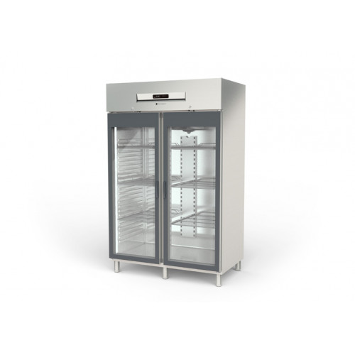 Armoire GN2/1 emboutie - Gamme classic - Température positive (-2°/+8°C) - Capacité 1404l - 2 portes vitrées (double vitrage) - Extérieur et intérieur en inox AISI-304 18/10 (sauf partie arrière) - Côtés emboutis et crémaillères centrales isolation épaisseur 75mm - Evaporateur anti-corrosion et compresseur hermétique ventilé - Thermostat électronique avec affichage digital - Evaporation automatique des eaux de dégivrage - Panneau de commande relevable pour faciliter l'accès au groupe - Eclairage intérieur LED - Serrure en standard - Pieds inox réglables de 135 à 200mm - Ambiance 43°C - Dotation : 3 clayettes GN2/1 inox par porte
