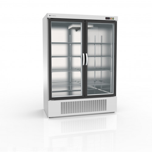 Armoire Gourmet - Température négative (-20°/-15°C) - Capacité 1201L - 2 portes vitrées - Extérieur Blanc et intérieur en inox AISI-304 (sauf partie arrière) - Evaporateur traité anti-corrosion - Thermostat électronique avec afficheur digital, spécial économie d'énergie - Dégivrage et évaporation par résistance - Eclairage intérieur LEDs - Pieds inox réglables de 125 à 200 mm - Ambiance 43°C - Alarme haute et basse température sur contrôleur digital - Dotation : 4 clayettes plastifiées par porte, réglables en hauteur sur glissières inox (4 paires par porte)