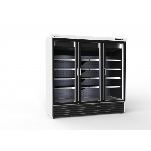 Armoire minimarket - Carrosserie extérieur blanc et intérieur noir - Portes vitrées (double vitrage) avec éclairage LED - Isolation polyuréthane - 4 + 4 étagères en acier laqué blanc réglables en hauteur livrées avec porte-étiquette - Froid ventilé - Rideau d'air sur toute la hauteur à l'intérieur de l'armoire en partie arrière - Evaporateur ventilé traité anti-corrosion - Dégivrage automatique avec évaporation automatique - Thermostat électronique à affichage digital - Panneau de commande et grille de ventilation du moteur démontable - Alarme porte ouverte et pour haute température de condensation - Température -25°/-18°C - Capacité : 1750 l