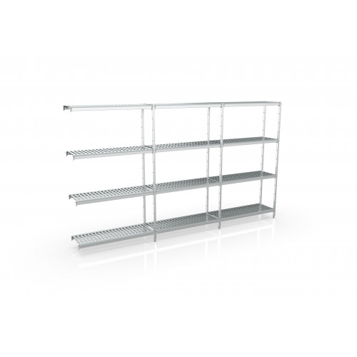 Rayonnage d'angle 4615x1370x500 4 niv - Spécialement conçu pour usage alimentaire - Structure aluminium anodisée - Clayettes en polyéthylène qualité alimentaire - Vis en acier inoxydable - Compatible à une utilisation en chambres froides, à la fois pour des températures positives comme négatives - Assemblage facile et sans outil