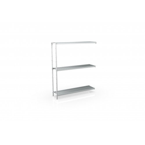 Rayonnage d'angle 1550x1370x400 3 niv - Spécialement conçu pour usage alimentaire - Structure aluminium anodisée - Clayettes en polyéthylène qualité alimentaire - Vis en acier inoxydable - Compatible à une utilisation en chambres froides, à la fois pour des températures positives comme négatives - Assemblage facile et sans outil