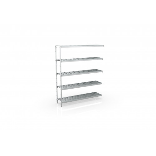 Rayonnage d'angle 950x1970x400 5 niv - Spécialement conçu pour usage alimentaire - Structure aluminium anodisée - Clayettes en polyéthylène qualité alimentaire - Vis en acier inoxydable - Compatible à une utilisation en chambres froides, à la fois pour des températures positives comme négatives - Assemblage facile et sans outil