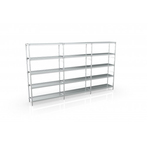 Rayonnage linéaire 3560x1970x500 5 niv - Spécialement conçu pour usage alimentaire - Structure aluminium anodisée - Clayettes en polyéthylène qualité alimentaire - Vis en acier inoxydable - Compatible à une utilisation en chambres froides, à la fois pour des températures positives comme négatives - Assemblage facile et sans outil