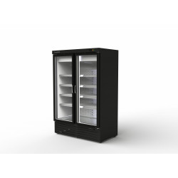 Armoire minimarket - Carrosserie extérieur noir et intérieur blanc - Portes vitrées (double vitrage) avec éclairage LED - Isolation polyuréthane - 4 + 4 étagères en acier laqué blanc réglables en hauteur livrées avec porte-étiquette - Froid ventilé - Rideau d'air sur toute la hauteur à l'intérieur de l'armoire en partie arrière - Evaporateur ventilé traité anti-corrosion - Dégivrage automatique avec évaporation automatique - Thermostat électronique à affichage digital - Panneau de commande et grille de ventilation du moteur démontable - Alarme porte ouverte et pour haute température de condensation - Température -2°/+8°C - Capacité : 1404 l