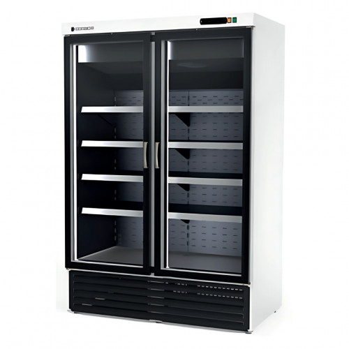 Armoire minimarket - Carrosserie extérieur blanc et intérieur noir - Portes vitrées (double vitrage) avec éclairage LED - Isolation polyuréthane - 4 + 4 étagères en acier laqué blanc réglables en hauteur livrées avec porte-étiquette - Froid ventilé - Rideau d'air sur toute la hauteur à l'intérieur de l'armoire en partie arrière - Evaporateur ventilé traité anti-corrosion - Dégivrage automatique avec évaporation automatique - Thermostat électronique à affichage digital - Panneau de commande et grille de ventilation du moteur démontable - Alarme porte ouverte et pour haute température de condensation - Température -2°/+8°C - Capacité : 1404 l