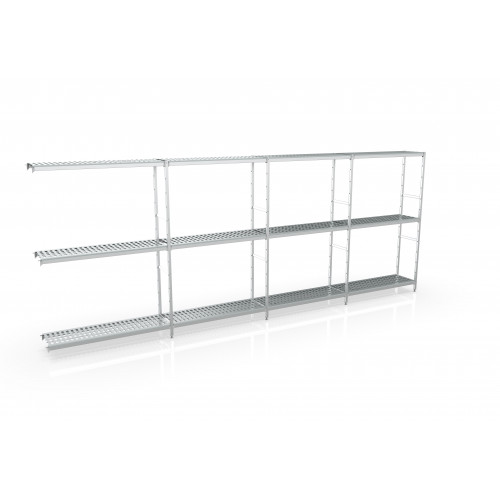 Rayonnage d'angle 5650x1370x400 3 niv - Spécialement conçu pour usage alimentaire - Structure aluminium anodisée - Clayettes en polyéthylène qualité alimentaire - Vis en acier inoxydable - Compatible à une utilisation en chambres froides, à la fois pour des températures positives comme négatives - Assemblage facile et sans outil