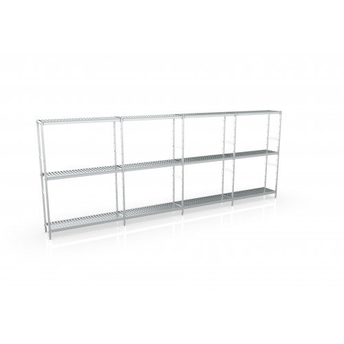 Rayonnage linéaire 6495x1970x500 3 niv - Spécialement conçu pour usage alimentaire - Structure aluminium anodisée - Clayettes en polyéthylène qualité alimentaire - Vis en acier inoxydable - Compatible à une utilisation en chambres froides, à la fois pour des températures positives comme négatives - Assemblage facile et sans outil