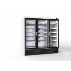 Armoire minimarket - Carrosserie extérieur blanc et intérieur blanc - Portes vitrées (double vitrage) avec éclairage LED - Isolation polyuréthane - 4 + 4 étagères en acier laqué blanc réglables en hauteur livrées avec porte-étiquette - Froid ventilé - Rideau d'air sur toute la hauteur à l'intérieur de l'armoire en partie arrière - Evaporateur ventilé traité anti-corrosion - Dégivrage automatique avec évaporation automatique - Thermostat électronique à affichage digital - Panneau de commande et grille de ventilation du moteur démontable - Alarme porte ouverte et pour haute température de condensation - Température -2°/+8°C - Capacité : 1750 l